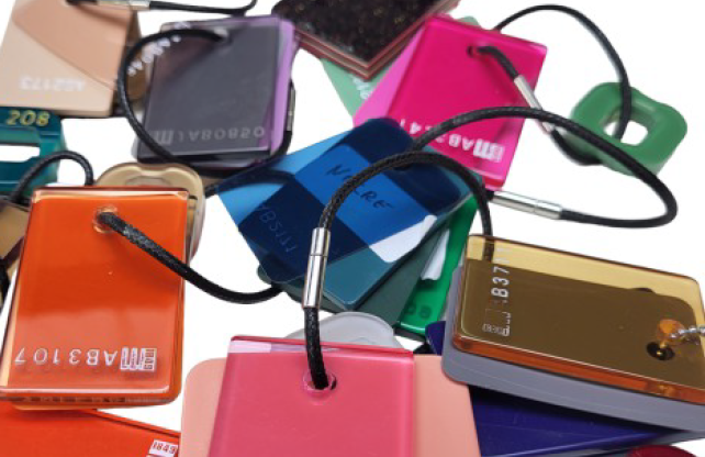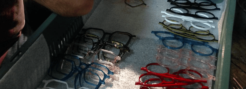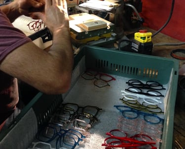 Les couleurs de nos bijoux et lunettes tranchent avec l'ambiance industrielle de l'atelier. Partout, des éclats de couleurs et des copeaux de matière créent un tableau vivant d'arc-en-ciel. Le contraste entre la matière brute et le sourire radieux de nos clients découvrant les créations est notre plus grande satisfaction.